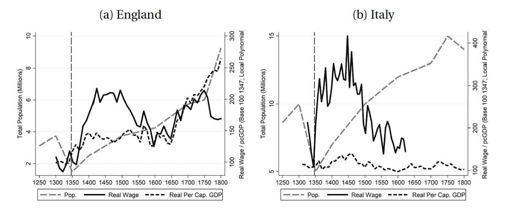 What then was the basis of the change in wealth distribution provoked by the Black Death? Simply put, the sudden shortage of labor raised wages and reduced the return on capital, thus diminishing inequality. The Black Death coincided with Europe’s gradual transition from a feudal to a more mercantile economy and in that context the rapid reduction in the availability of agricultural workers meant that landowners needed to pay them more, while the relative value of their lands decreased. However, when examined in more detail, the economic effects of the plague varied widely from place to place. Thus, as seen in Fig.2, while Italy and England suffered fairly similar proportional population declines, the positive effects on wages in Italy were higher than in England, while the resumption of GDP growth was much slower. Thus, both the underlying state of the local economy and the political context modulated the economic effects of the Black Death. A particularly notable deviation from the trend toward decreased inequality took place in eastern Europe where harsh regimes forced agricultural workers into a more severe form of serfdom. Despite the local variation, however, in general, the decades after the zenith of the plague saw a substantial and enduring improvement in the economic well-being of the laboring classes.