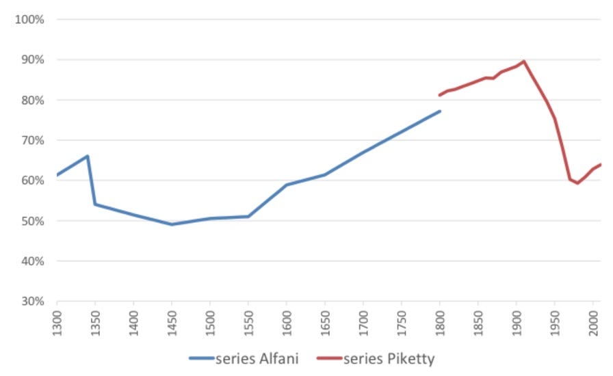 Fig 1. The share of wealth of the richest 10% in Europe 1300-2010. Alfani 2017