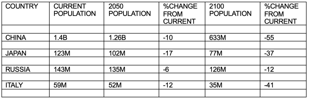 However, the decimation caused by the Black Death was truly exceptional, proportionally far greater than losses in the two world wars or the 1918 flu pandemic. Will the modern world ever see a similar loss of population? The answer, of course, is yes! If UN demographers are correct, between now and 2100 a number of nations will be impacted by population declines comparable to those seen during the Black Death, with some experiencing very substantial declines by 2050. Examples are shown in Table 1 with China experiencing the greatest decline both numerically and in percentage terms.